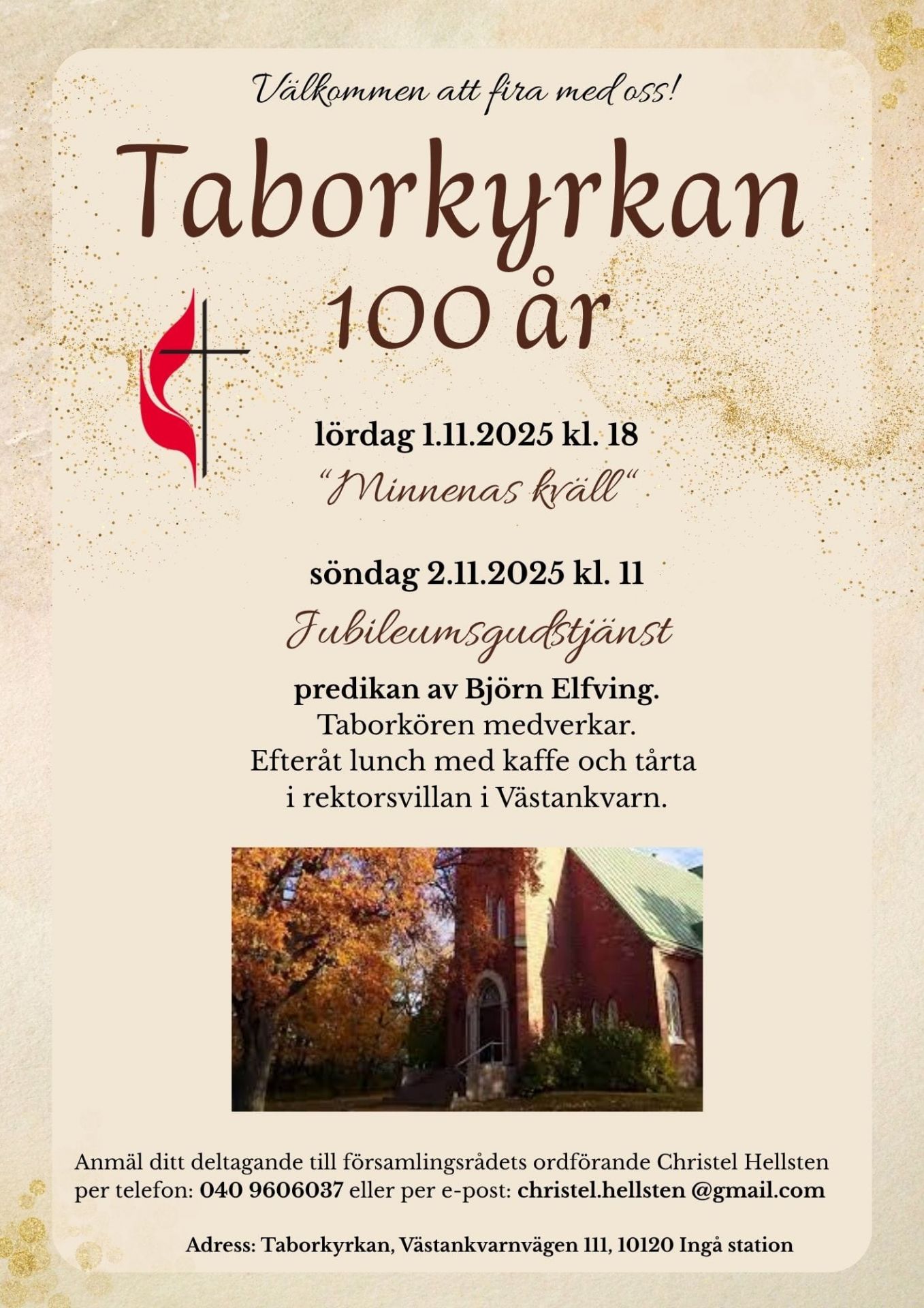 Taborkyrkan i Ingå 100 år Ingå svenska metodistförsamling grundades år 1925 och samma år invigdes Taborkyrkan. Jubileumsgudstjänst 2.11.2025 kl 11. Alla välkomna! Anmäl ditt deltagande till